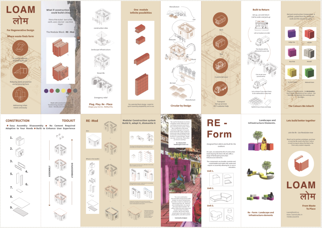 该项目提出了“Re-Mod”的概念:一种由建筑垃圾制成的模块化建筑系统,专为那些我们忽视却又依赖的空间而设计:街头市场、茶摊、工具棚和临时工棚。该项目位于快速扩张的古尔冈,旨在应对一场无声的危机:大量的建筑垃圾,以及赋予城市节奏的非正规经济正在逐渐消失。该系统将垃圾转化为可堆叠、无水泥的砌块,可以反复组装、拆卸和重复使用。