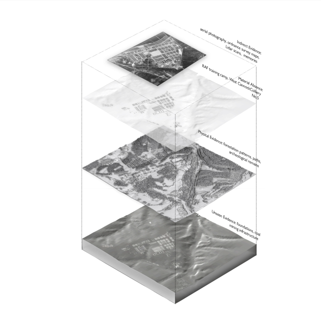 许多受保护的景观都是经过战略性建设的区域,通常在自然保护的前提下,没有人类居住。这片位于坎诺克蔡斯(Cannock Chase)的景观,曾是一处军事训练场,现已成为杰出自然风景区(AONB)。该景观经过了针对密集建筑区域的保护处理。这导致遗址被刻意省略。因此,这片景观的体验非常随意,很大程度上取决于游客自身的想象。