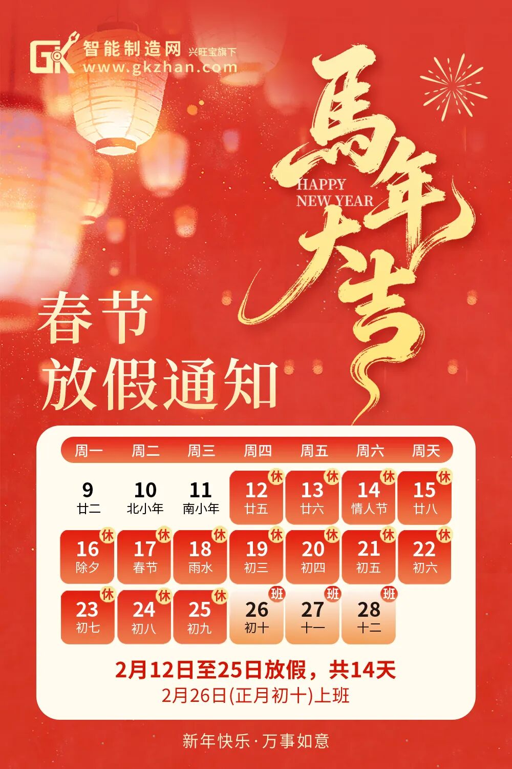 智能制造网2026年春节放假时间为:2026年2月12日-2月25日,共14天,2月26日(正月初十)正常上班。放假期间,如有紧急情况,请与我们值班人员电话联系 :15869012768, 技术QQ:248767757。