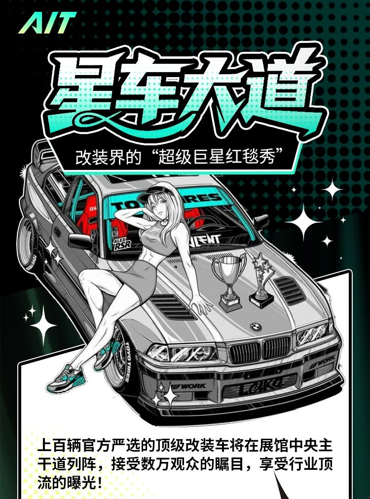 展会突出特点表现在“四新”:即新能源(开辟新赛道)、新改装(转型新抓手)、新技术(利润新增量)、新场景(抢到新客户)。此外,AIT星车大道尤为亮眼,在展馆中间,辟出一条“星光大道”,展出各地和各种牛逼改装汽车,让观众一日看尽天下奇车!