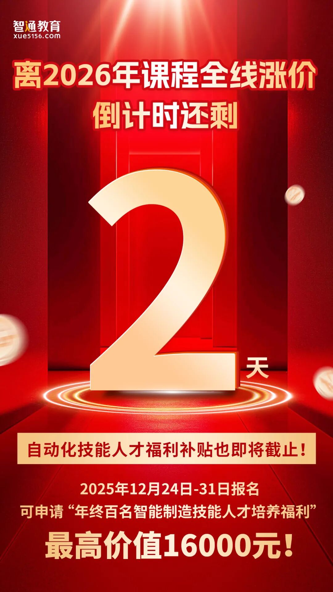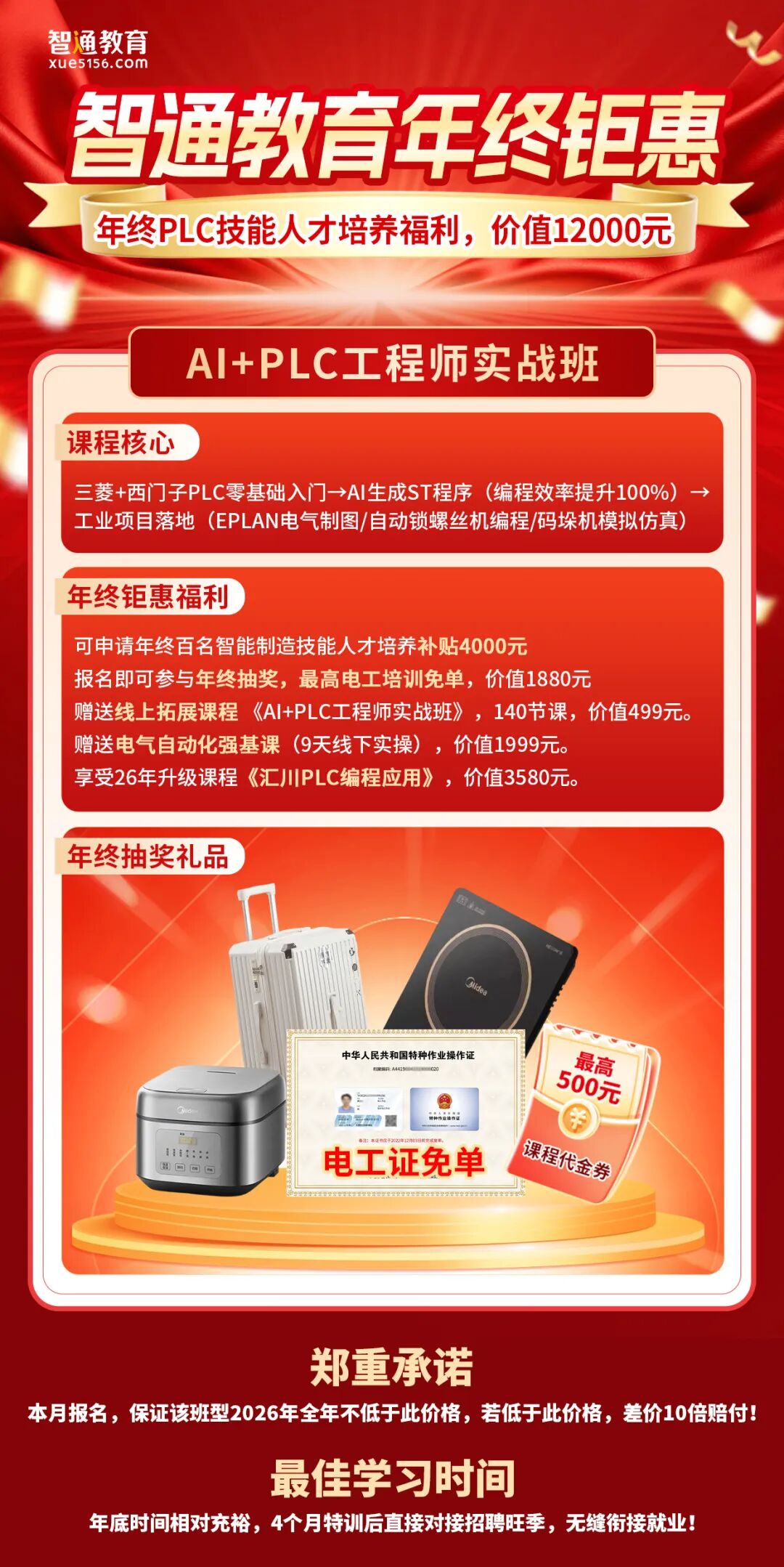 正值2025年末,智通学院同步推出“年终百名智能制造技能人才培养计划”,为提前规划2026学习的学员提供专项补贴与课程赠礼: