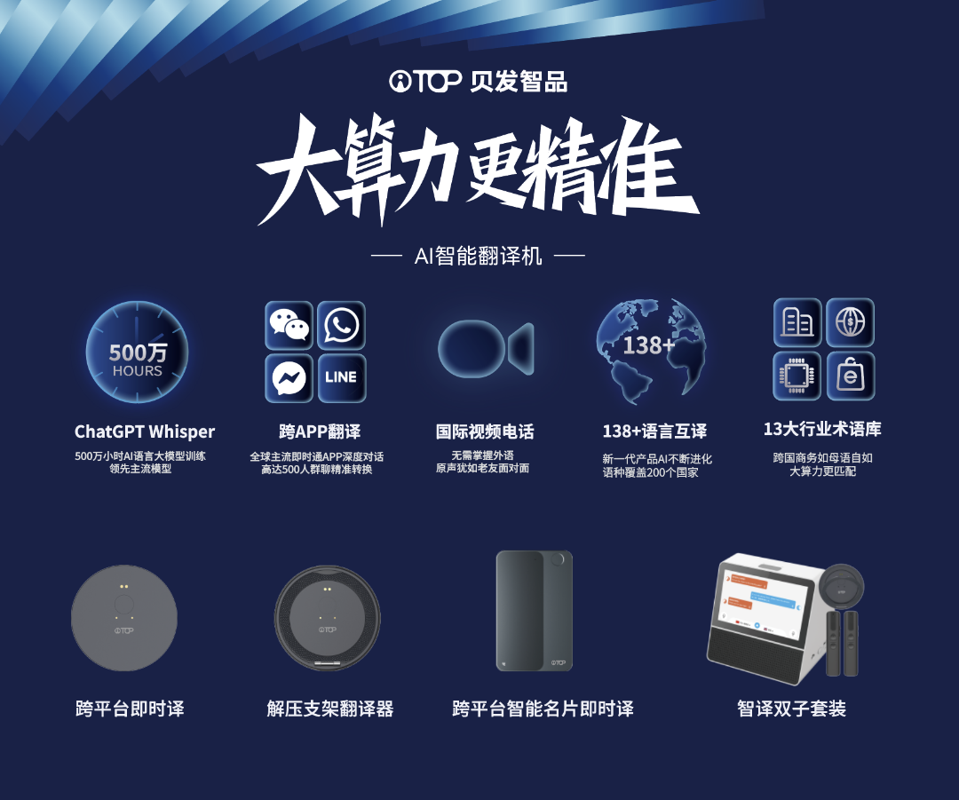 AI智能系列产品:依托深圳 AI 研发中心与浙江省产学研智创联合实验室的硬核实力,明星产品直击外贸、跨境、文旅全场景沟通痛点,定义智能硬件新标杆。