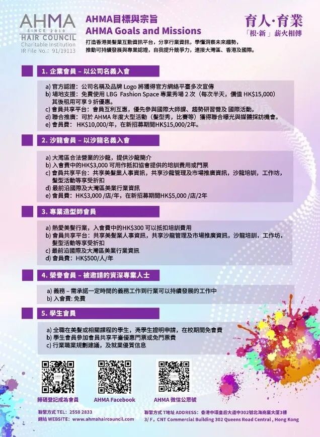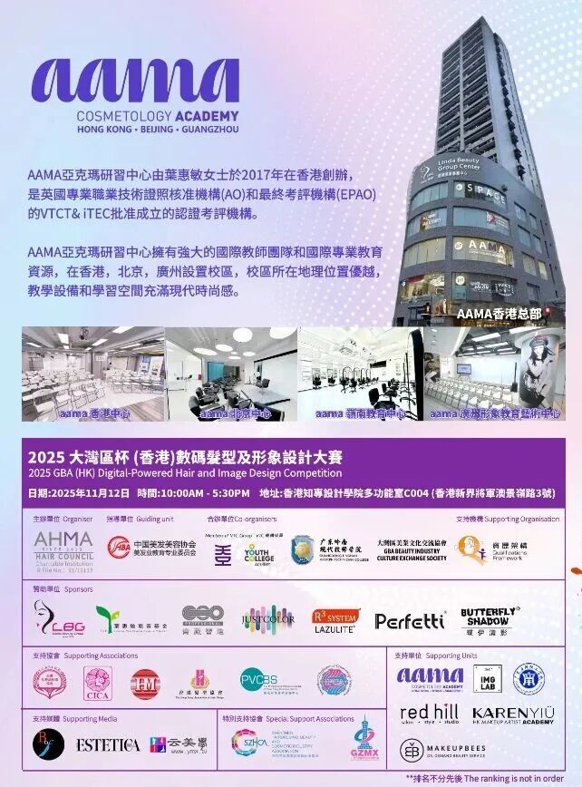 此次大赛由 AHMA HAIR COUNCIL 主办,中国美发美容协会美发业教育专业委员会指导,并获得香港知专设计学院、青年学院、广东岭南现代技师学院及大湾区美业文化交流协会的联合支持,并吸引了众多知名机构的鼎力支持。