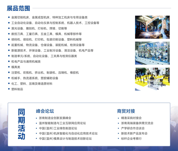 第33届中国(温州)国际机床、模具展览会:集中展示高端数控机床、精密模具制造技术、智能化生产线解决方案,推动浙南地区装备制造业提质增效。