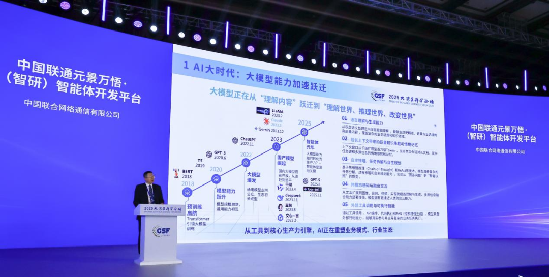 12月7日下午,由广东省科学技术厅、鹏城实验室、南沙区人民政府等单位联合主办的2025大湾区科学论坛人工智能分论坛暨第六届中国(广东)人工智能论坛在广州南沙国际会展中心隆重举行。本届论坛以“AI & Governance”为主题,围绕人工智能前沿技术发展、创新与治理、大模型创新应用等主题共话行业未来,中国联通亮相本次分论坛,集中展现AI技术实力与场景落地能力。