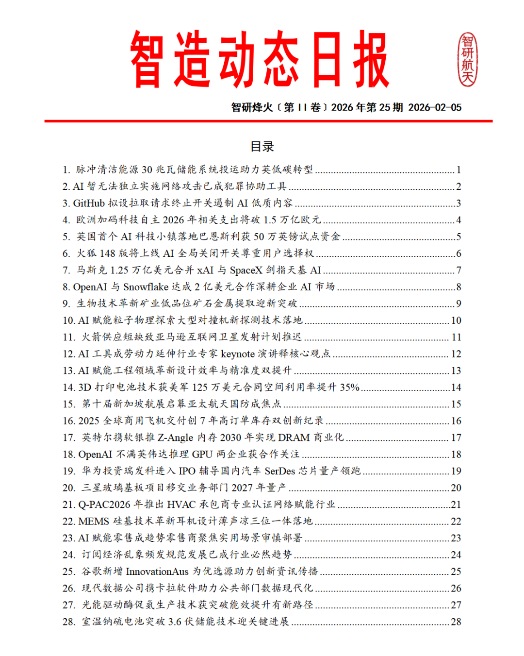 聚焦全球智能制造领域的权威情报产品,每日精选航空技术与应用、人工智能、工业机器人、增材制造、芯片工艺等核心技术突破与产业动态,以结构化、可编辑的文档形式呈现。内容涵盖技术解析、企业战略及政策影响,依托资深专家团队及强大的开源情报处理能力,助力企业快速捕捉技术趋势与市场机遇,把握智造脉搏,引领产业升级。