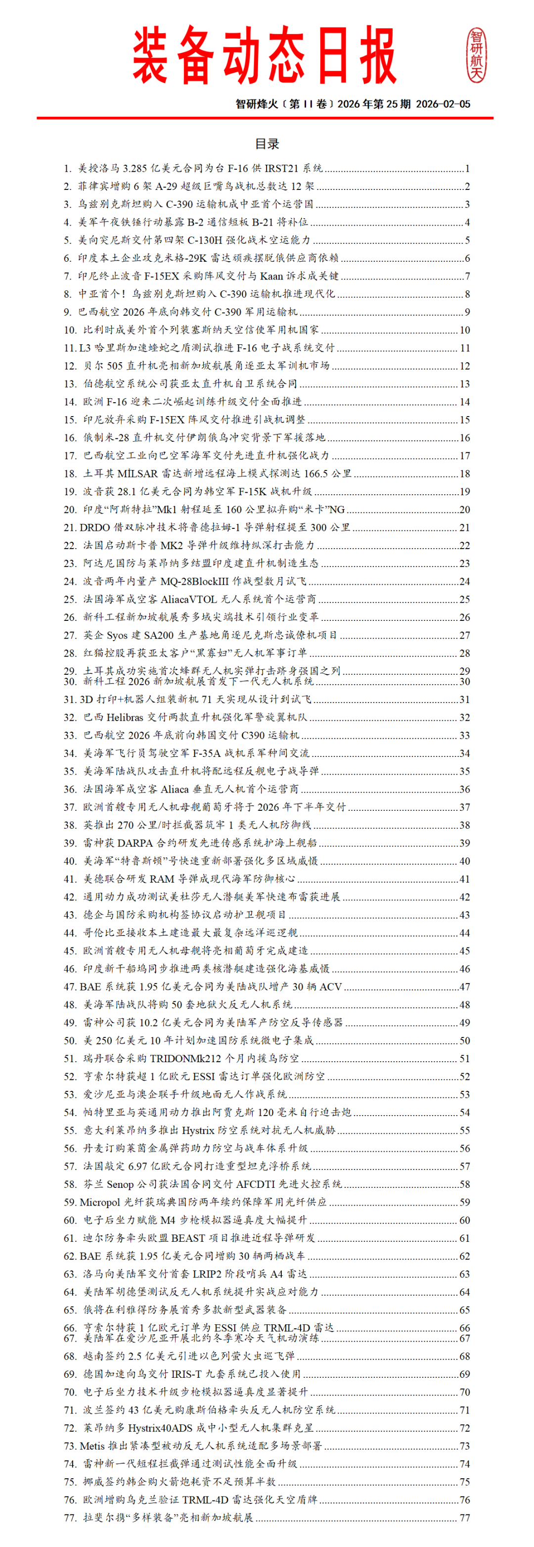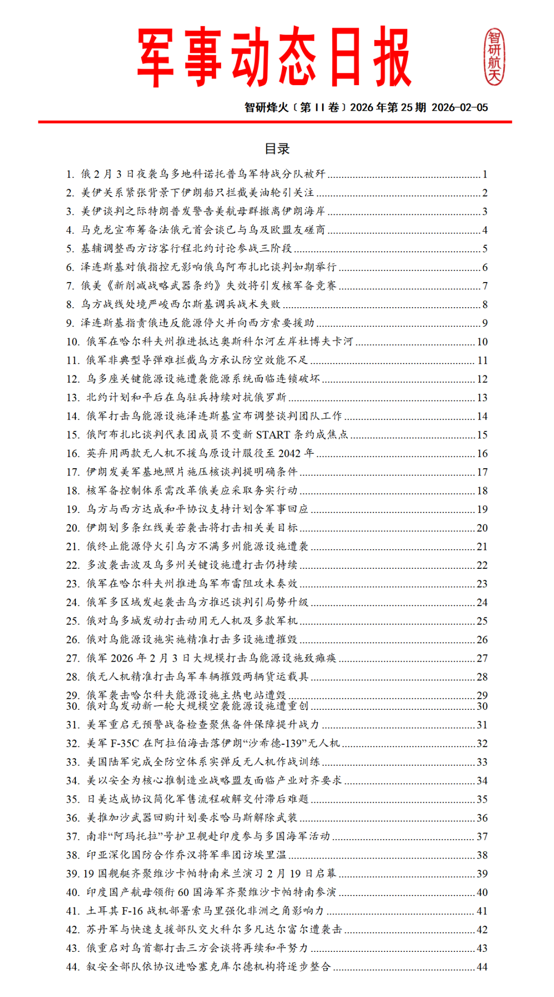 《全球防务动态》系列专刊国内独家每日发布涵盖航天领域、武器装备、军事热点、人工智能、先进制造等领域的全球动态信息。提供“航天动态专报”、“装备动态专报”、“军事动态专报”、“智造动态专报”以及“航天防务新闻日报”等特色产品模块。工作日每日推送,形成结构化、可编辑的文档,供订阅用户在小程序“智研烽火信息”商城下载。每日及时的动态信息能够有力支持各单位进行要讯报送、军情研究与安全形势分析的需求。