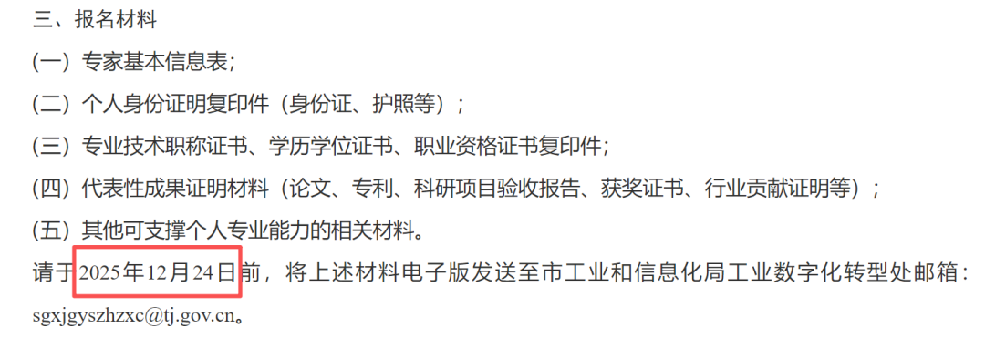 时间非常紧迫!申报材料需在2025年12月24日前提交,这意味着您仅剩不到48小时。强烈建议您立即行动,优先确保(一)基本信息表与(三)关键证书等核心材料齐备,再快速整理(四)中最能证明您能力的2-3项代表性成果。请务必一次将材料打包发至指定邮箱,并注意文件清晰、命名规范。这是一次高价值的官方入库机会,即使时间有限,精准、高效的准备也能让您在截止前成功“压哨”申报,切勿因拖延错过。