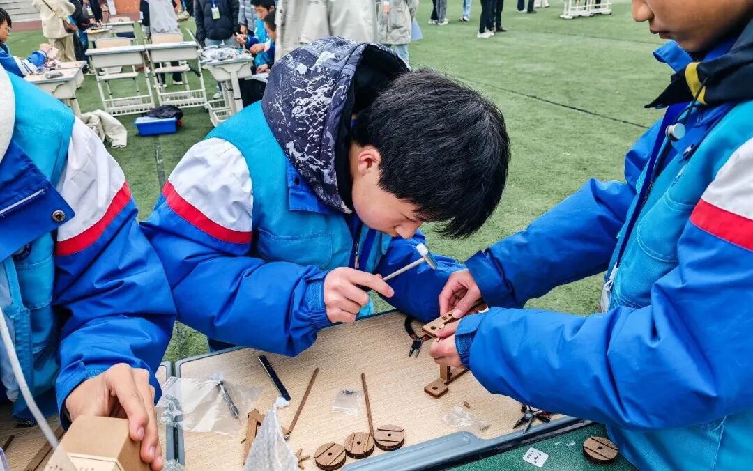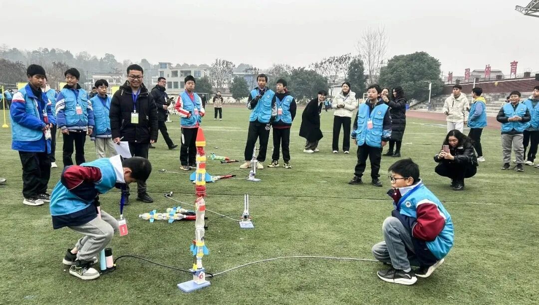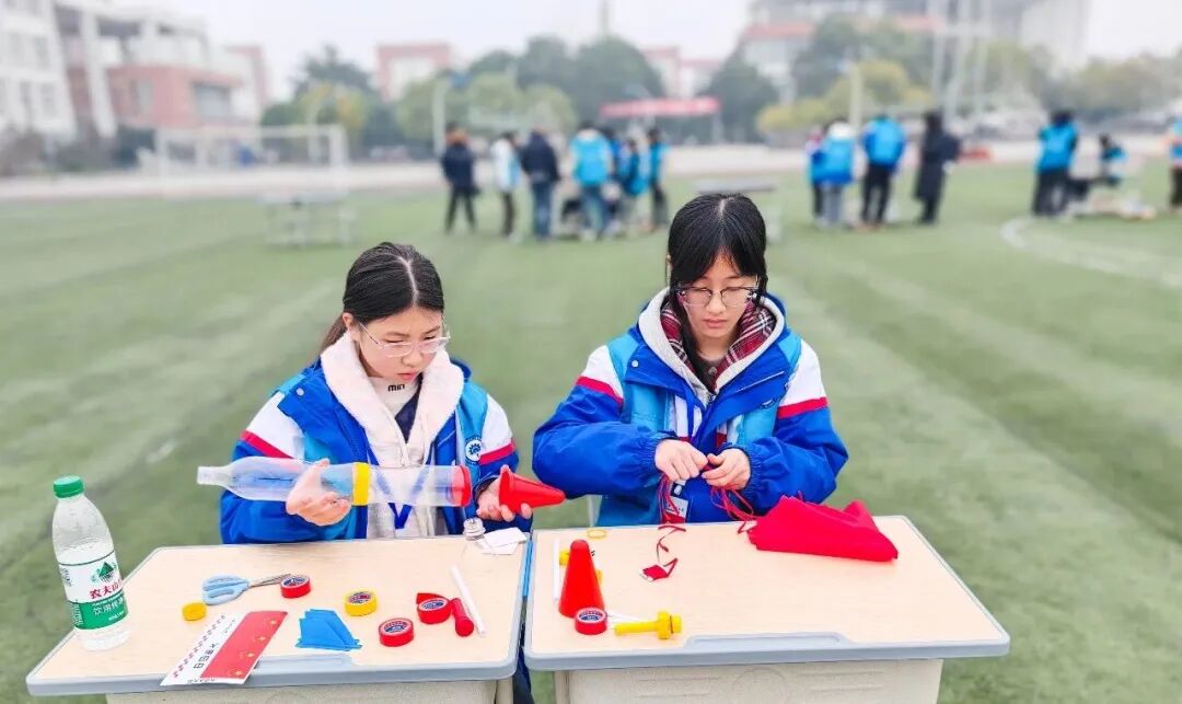 竞赛阶段,水火箭制作与飞行、橡皮筋动力航模制作与飞行、温度感应散热装置、光线感应照明装置、投石机制作与投射、智能交通灯搭建与编程、无人机基础操控等七大项目在指定区域同步开展。