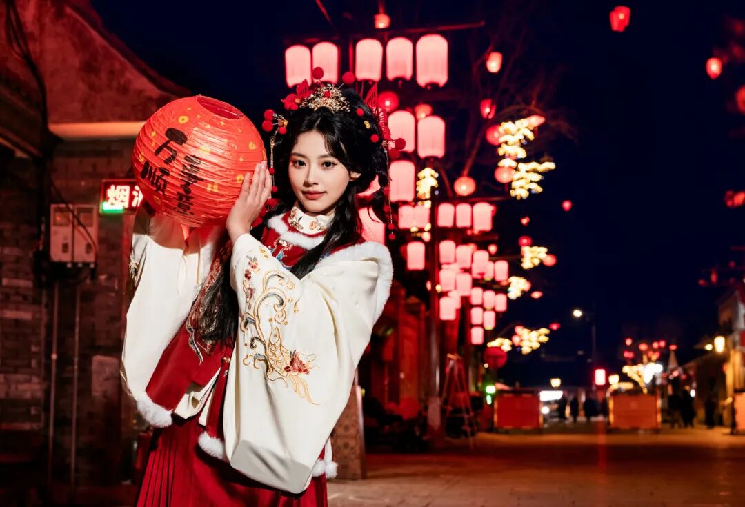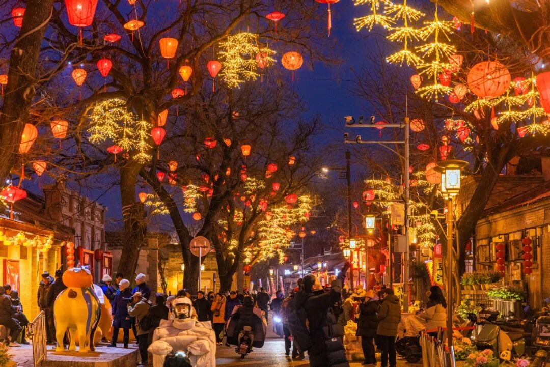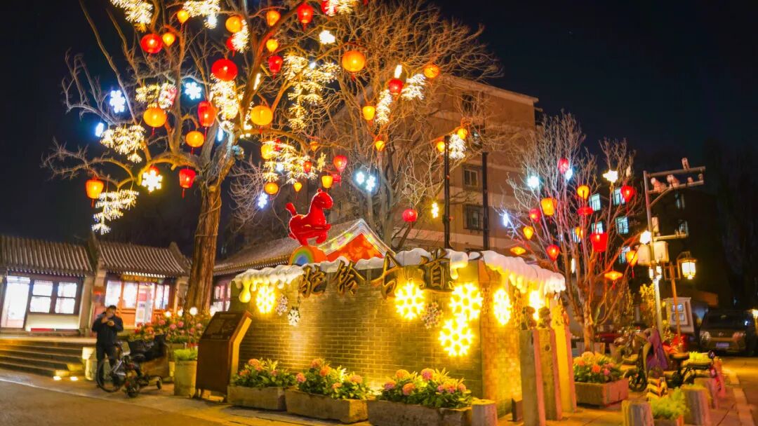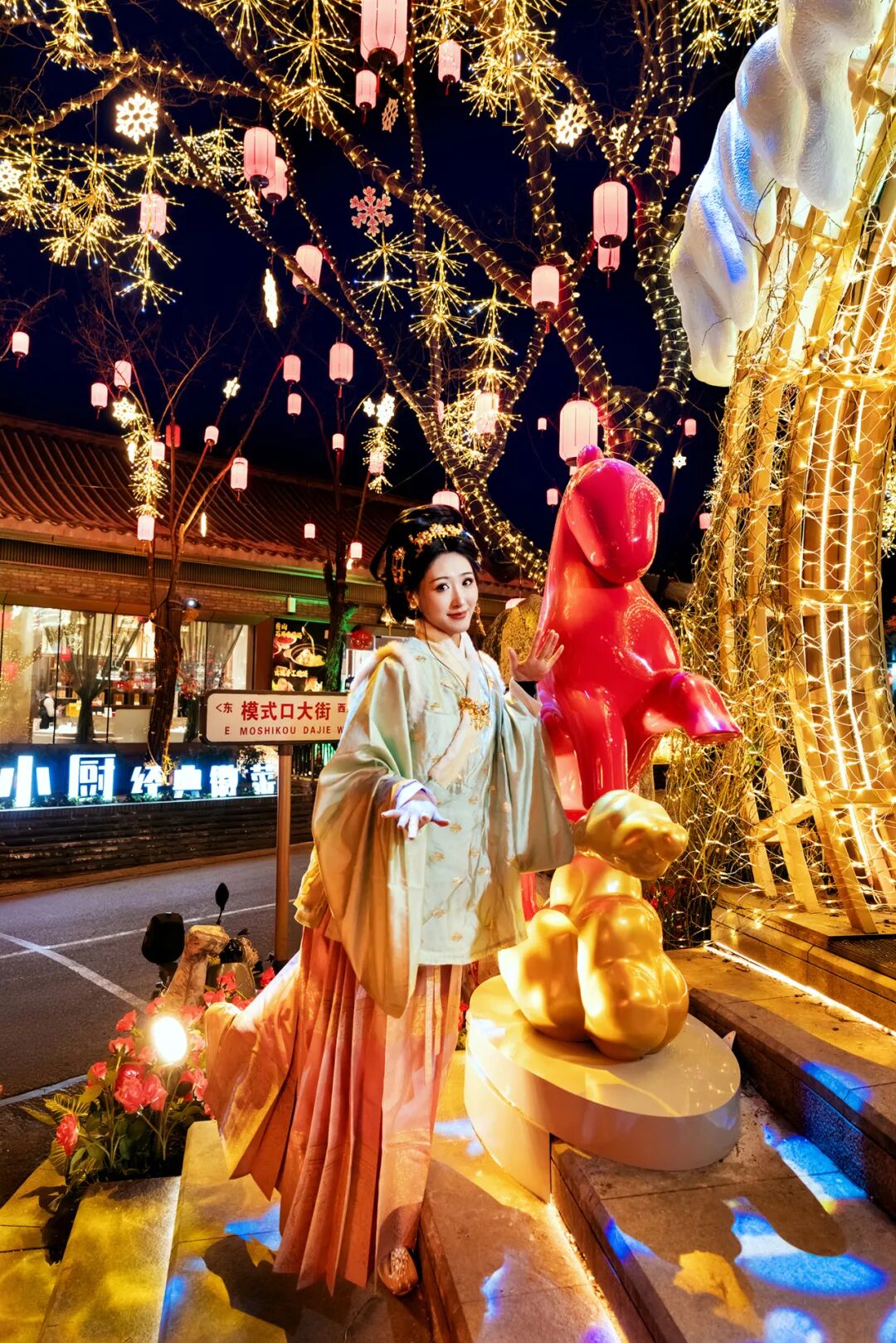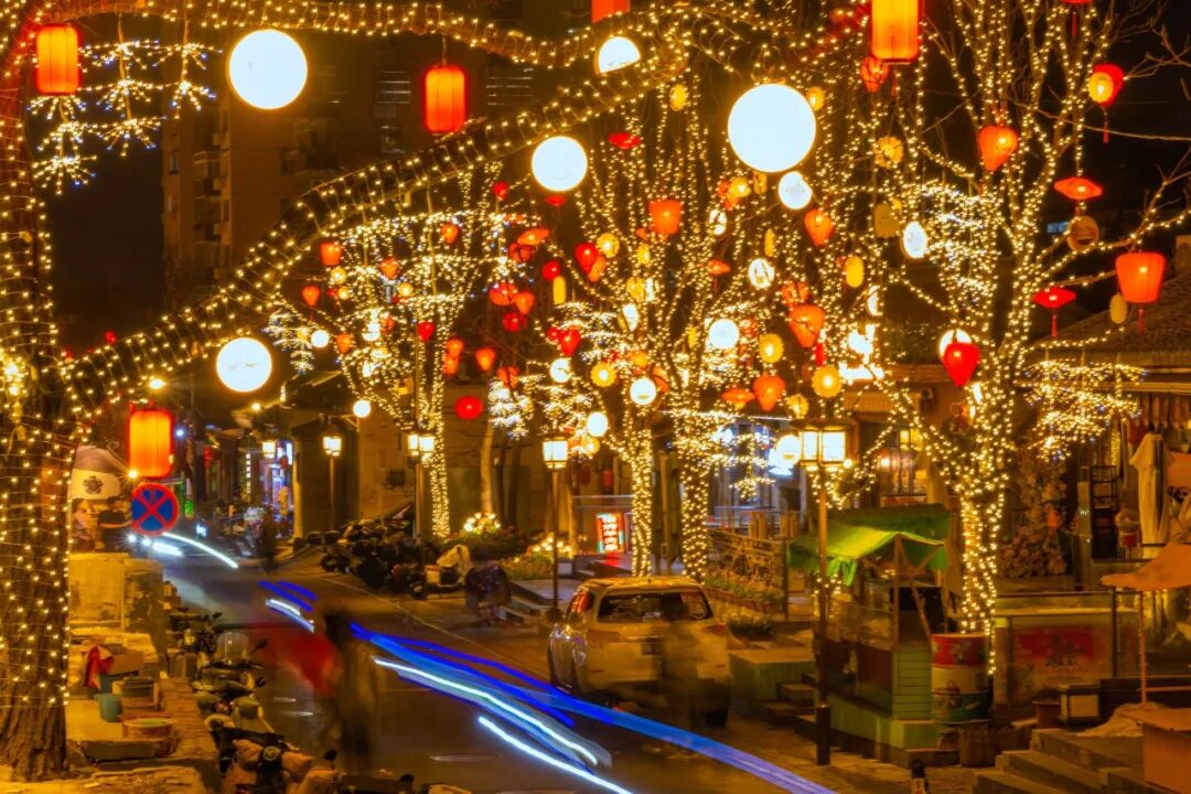 飞檐下是成串的灯笼,枝头间是流动的光河