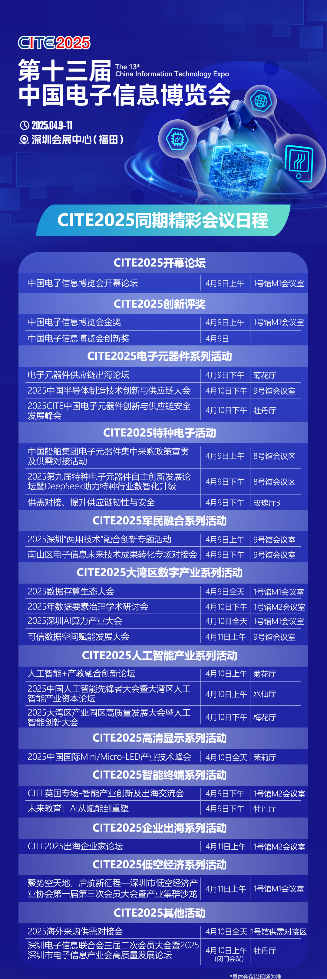 CITE2025深圳电子展 同期举办 2+8+N 活动,会议主题覆盖智能终端、AI 算力等热门领域,中国移动、华为昇腾等 500 + 领军企业、专家、学者汇聚,深入探讨行业热点、痛点与技术创新,剖析电子信息产业未来前沿,日程如下。