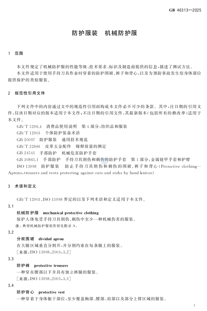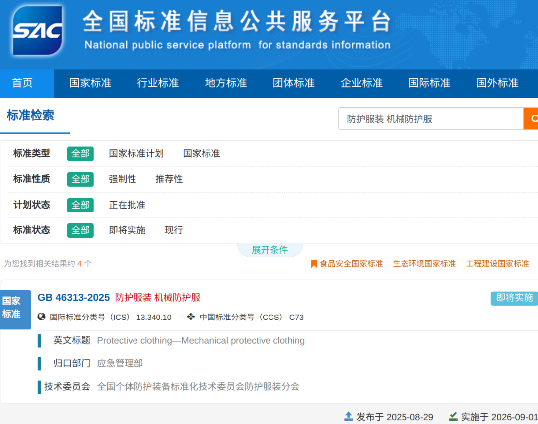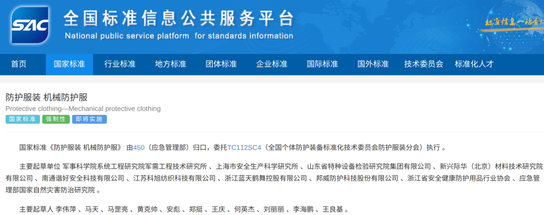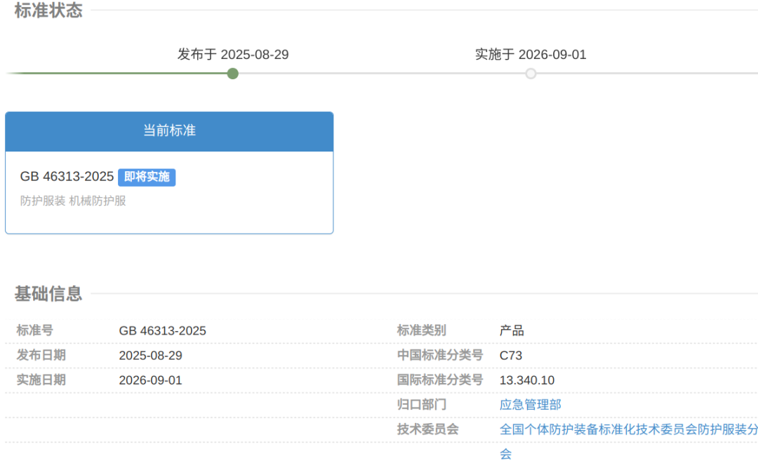 GB46313-2025防护服装 机械防护服来源:全国标准信息公共服务平台市场监管总局发布42项劳动防护用品强制性国家标准!免费下载!GB 28895-2025《防护服装 抗油易去污防静电防护服》GB30041-2025头部防护装备的选择、使用和维护《呼吸防护装备的选择、使用和维护》(GB18664-2025)发布,2026年9月1日实施GB24536-2025 防护服装 化学防护服的选择、使用和维护GB 23468-2025坠落防护装备的选择、 使用和维护(征稿+编制说明)GB 23466-2025《听力防护装备的选择、使用和维护》2026年9月1日实施关于批准发布《坠落防护 安全网》等49项强制性国家标准的公告