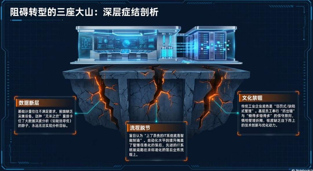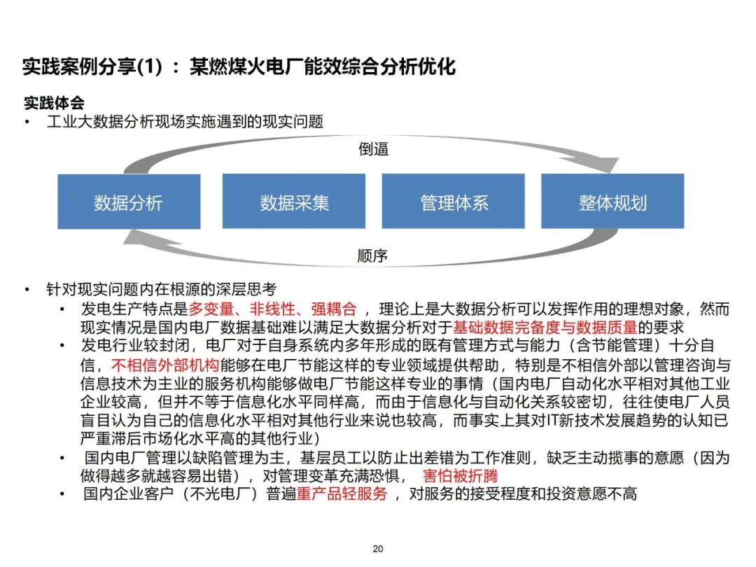国内的关键瓶颈主要体现在以下三个方面:第一,数据基础不够扎实,例如火电厂等大型企业的数据不够完整,不能满足大数据分析的需要;二是企业重视产品而忽视服务,不愿意投入与智能制造有关的服务;三是落后的管理模式、基层工作人员的改革积极性不高、产业的封闭性和对外来技术力量的接受程度不高。