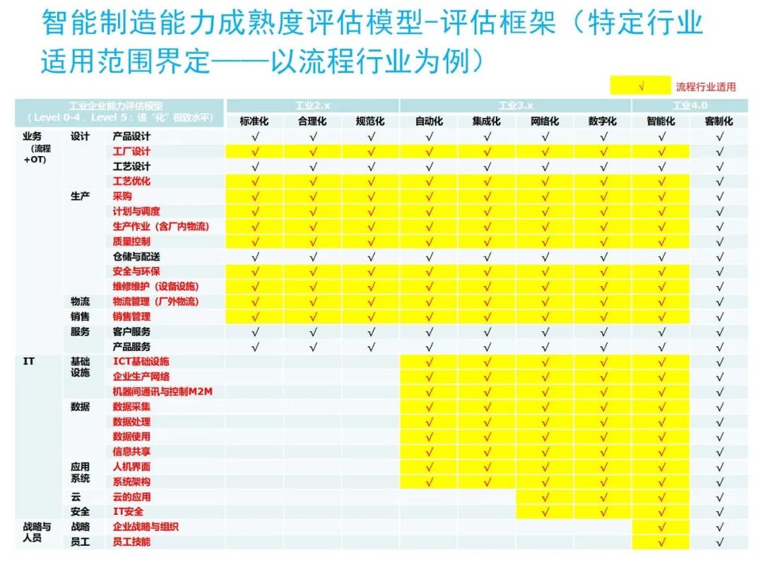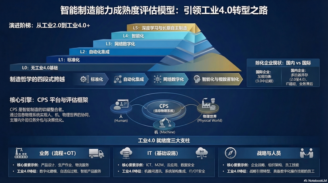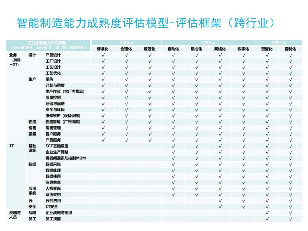 模型以信息-物理生产技术(CPS) 为核心构件,融合协作机器人、工业互联网(IoT)等技术,评估维度涵盖三大板块:业务(流程+OT,含设计、生产、物流等全链条)、IT(基础设施、数据、应用系统等)、战略与人员(企业战略组织、员工技能)。