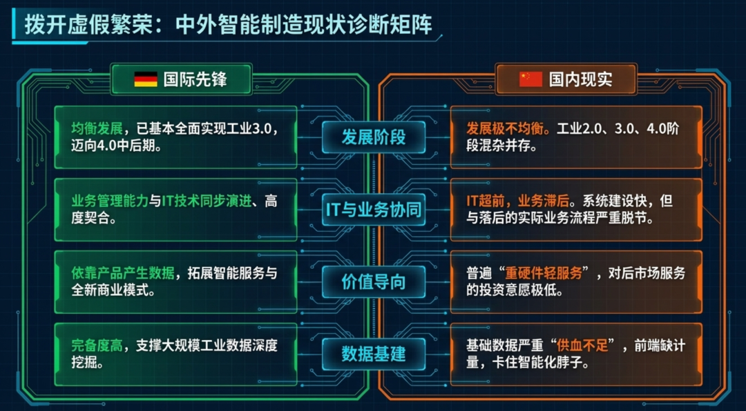 而国内企业则是直接跨越了一些传统的产业阶段,将工业4.0的相关技术进行了布局,这就造成了“基层不牢,高层先行”的现象:一些老企业还在对工业2.0进行标准化的“补课”,而一些新企业已经开始了智能化的尝试,尤其是国内的 NOC (国企)企业,他们在 IT系统的部署上走在了前面,但是并没有和业务流程的优化同步进行。