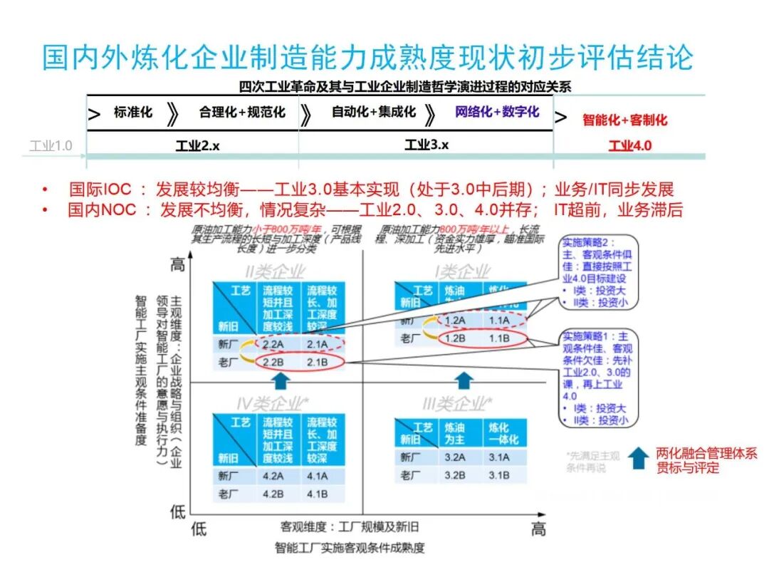 国内企业则需要兼顾流程型(如炼油、发电等)和非流程型(如炼油、发电等)制造业,实现战略差异化:新建大型企业(如年原油加工能力在800万吨以上的企业)可直接参照工业4.0标准;在工业2.0和3.0阶段,老企业和中小型企业首先要补上标准化和自动化的课程,然后才是智能化。