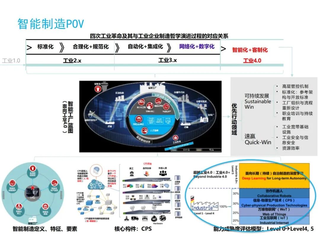 德国的核心场景是“离散制造”,其重点是产品的智能化和生产的协同,重点是 CPS上人-机和机-机的协同,重点是产品的智能化服务和基于数据的预知维修等产品的全寿命数字化管理。