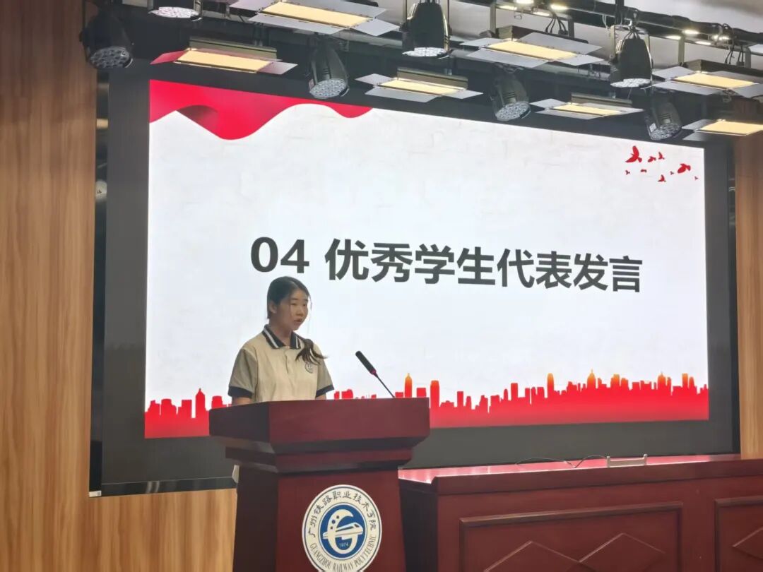 优秀学生代表吴珈如深情致辞,她衷心感谢学院领导与老师的悉心培育,分享了自身在学习探索、学生工作及志愿服务中的成长感悟。她表示,荣誉是肯定更是鞭策,自己会戒骄戒躁、继续奋进。同时,她鼓励同学们珍惜大学时光,敢于有梦、勤于圆梦,脚踏实地且心怀集体,以奋斗之姿勇攀高峰,携手共创学院新佳绩。