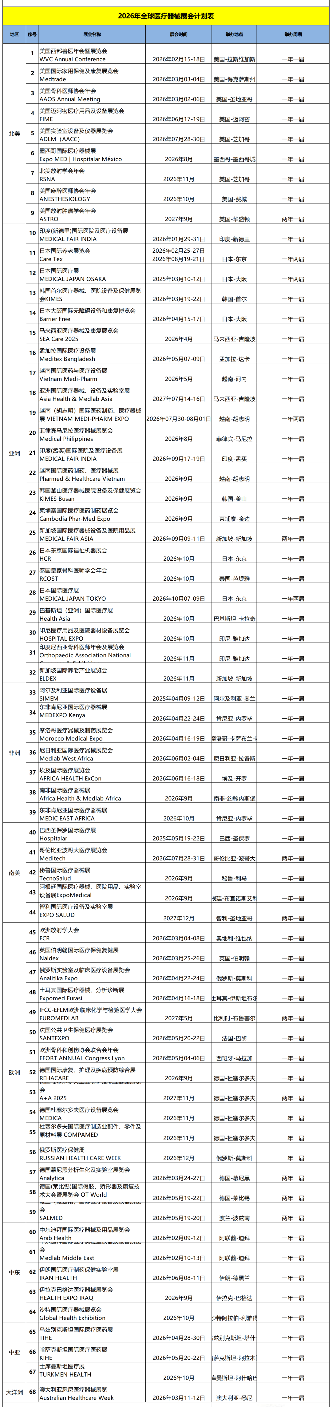 医疗产品:医疗设备及仪器、医用消耗品、救护设备、外科设备、诊断设备及用品、分析及控制,监护设备、手术设备、预防医学设备、眼科仪器及设备、耳鼻喉科设备、牙科用品和设备、放射医学设备、医用试剂及设备,假肢及康复器材、医疗保健品及器材、医疗机构及实验室技术设备、医学信息及技术交流、医院工程电信和数据传输设备、医疗消毒设备、废物处理设备、冷库设备、救护车及配套设备、美容仪器、医学纺织品、医学建筑技术、医疗卫生服务与医学出版物等。