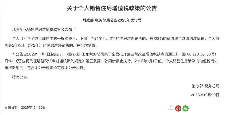 1、昨天1个重磅政策财政部、税务总局发布《关于个人销售住房增值税政策的公告》称,个人(不含个体工商户中的一般纳税人,下同)将购买不足2年的住房对外销售的,按照3%的征收率全额缴纳增值税;个人将购买2年以上(含2年)的住房对外销售的,免征增值税。