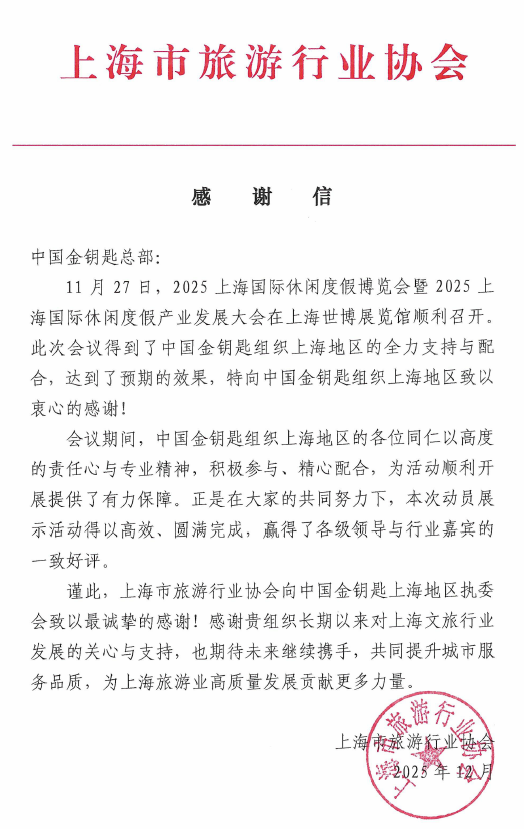 9.12月获上海旅游行业协会发来的感谢信,对中国金钥匙上海地区各位同仁在2025上海国际休闲度假博览会暨2025上海国际休闲度假产业发展大会期间以高度的责任心与专业精神,积极参与、精心配合,为活动顺利开展提供了有力保障,赢得了各级领导与行业嘉宾的一致好评表示感谢。