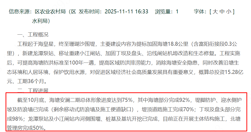 根据2025年11月的官方进展,海塘安澜二期总体形象进度达到75%,  其中海塘部分完成92%,堤脚防护、迎水侧护坡以及防浪墙已经完成,堤顶道路施工完成70%。