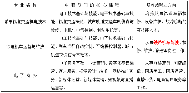 2、轨道交通类专业:铁道机车运用与维护、城市轨道交通机电技术等。