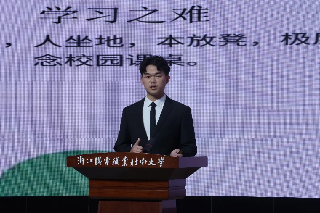 学生代表李士钦、徐嘉楠先后上台发言。他们分享了自己在学习、竞赛与集体生活中的成长经历,畅谈了对专业学习的感悟与对未来的规划,言语间满是对学院培养、老师教导与同学陪伴的感恩之情,并号召全体同学以榜样为镜,笃学实干、勇于创新,在智能制造的赛道上奋勇争先。