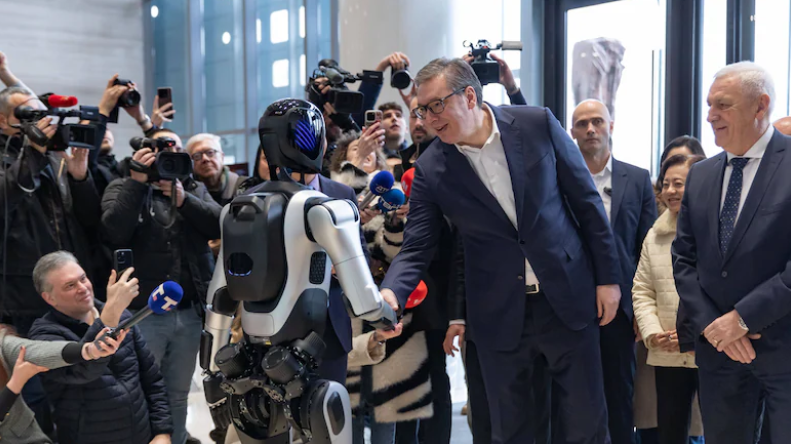 图片来源:塞尔维亚总统武契奇带着演示机器人,除了预算任务,边境保护和军事支持也在计划之中——尽管存在公开的技术和能源风险。IMAGO / Xinhua IMAGO/新华社截图