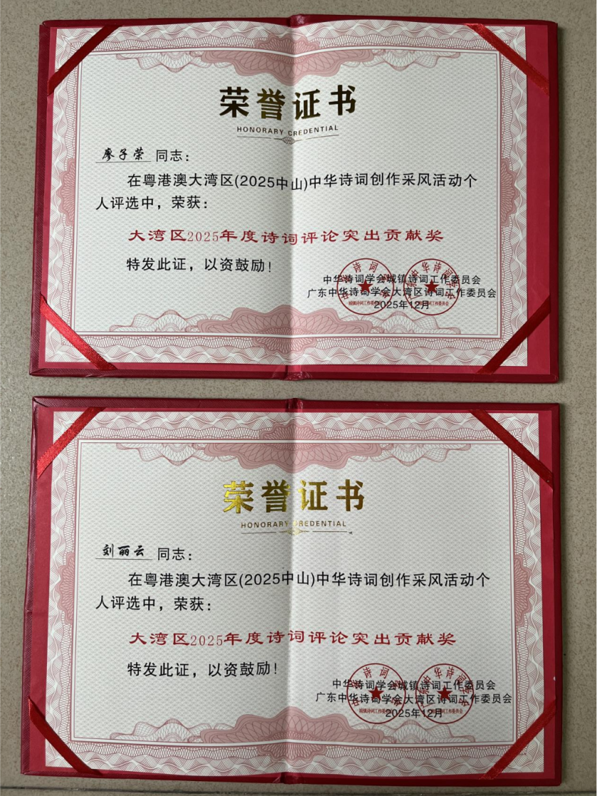 廖子荣、刘丽云分别获“大湾区2025年度诗词评论突出贡献奖”。