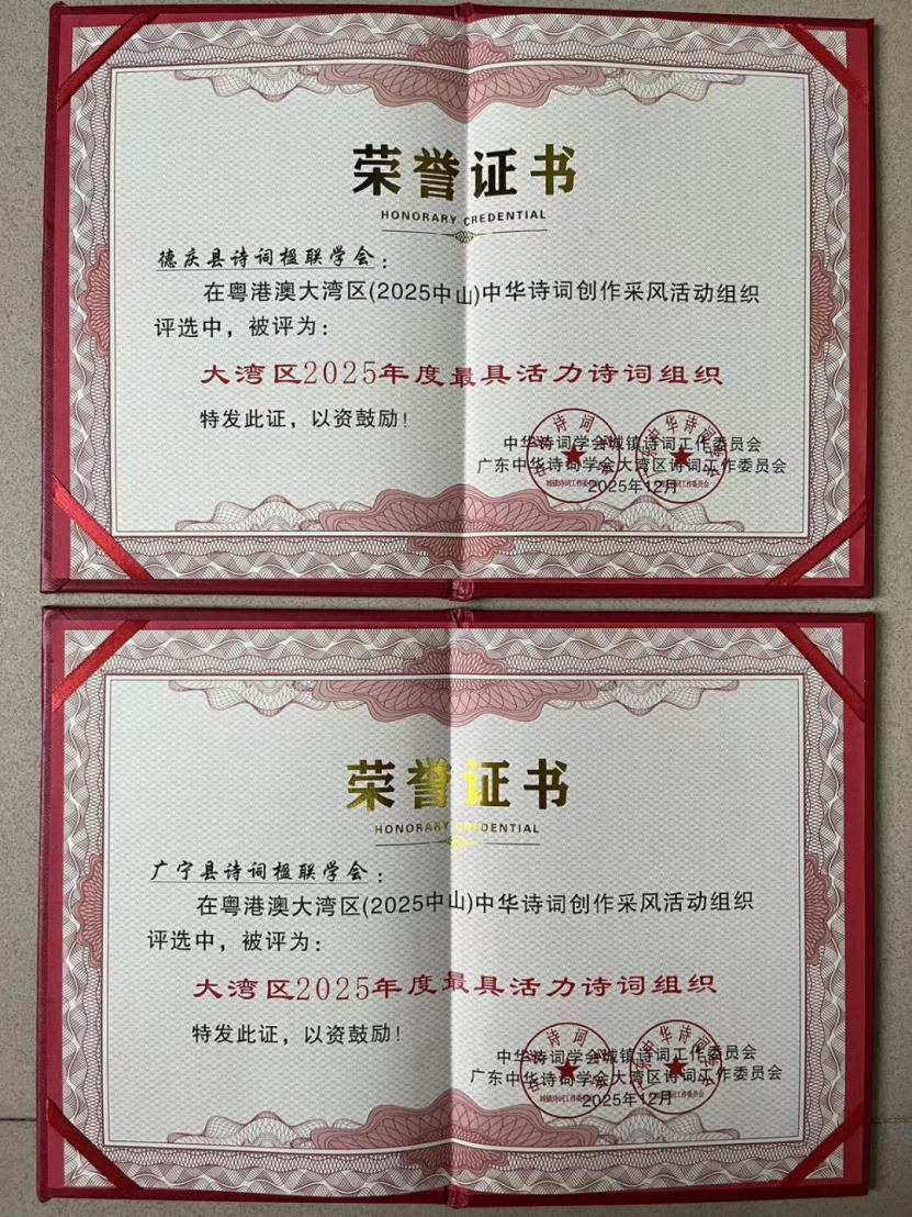 德庆、广宁县诗联学会分别获评“大湾区2025年度最具活力诗词组织”。