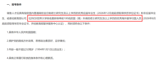报考条件:QS 世界大学排名前 100 境外高校硕士及以上,2026 年 6 月底前完成学历认证;