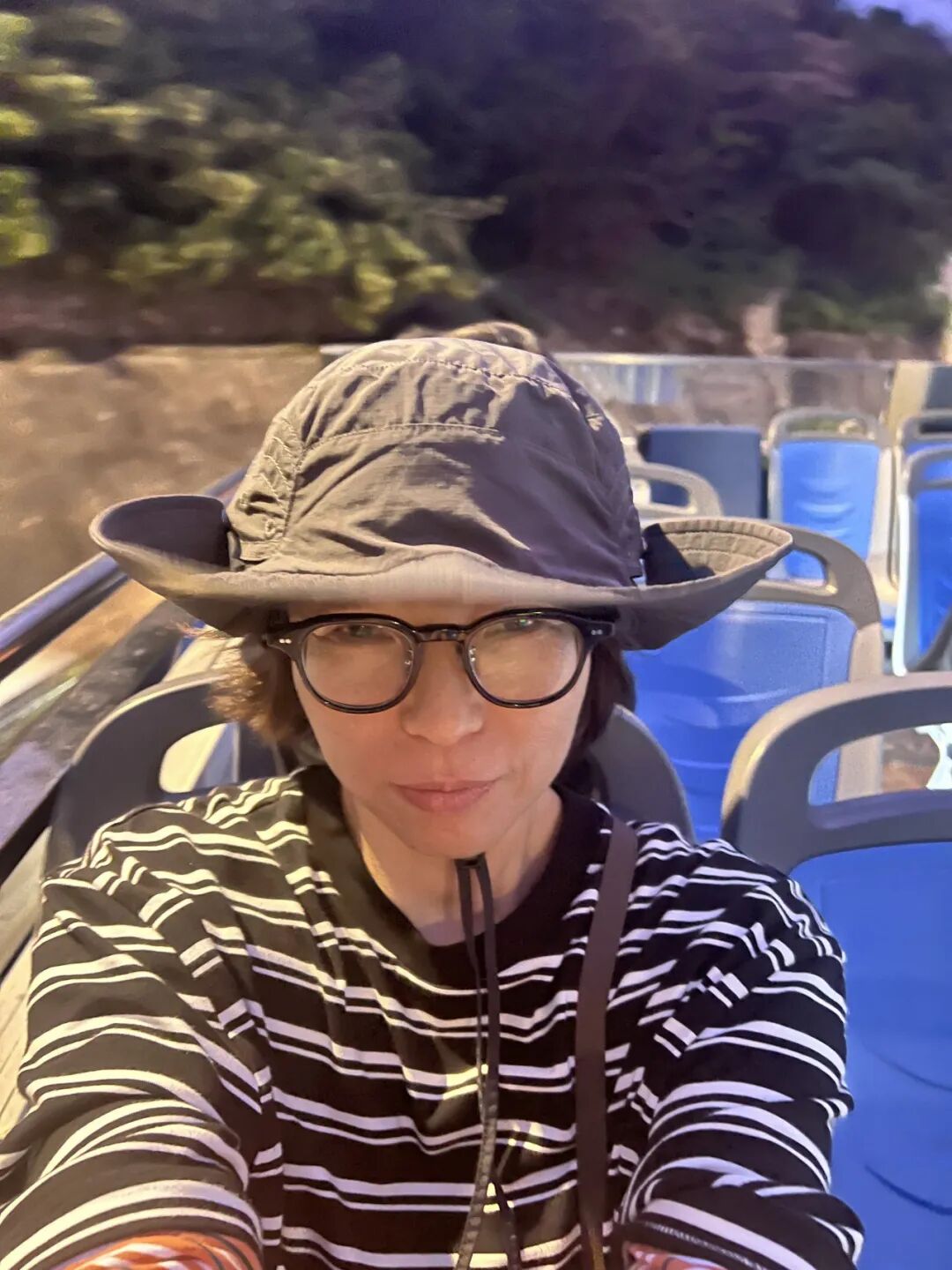 在半敞篷的双层巴士上吹风和享受没有落日的落日飞车(几近吹飞的帽子)