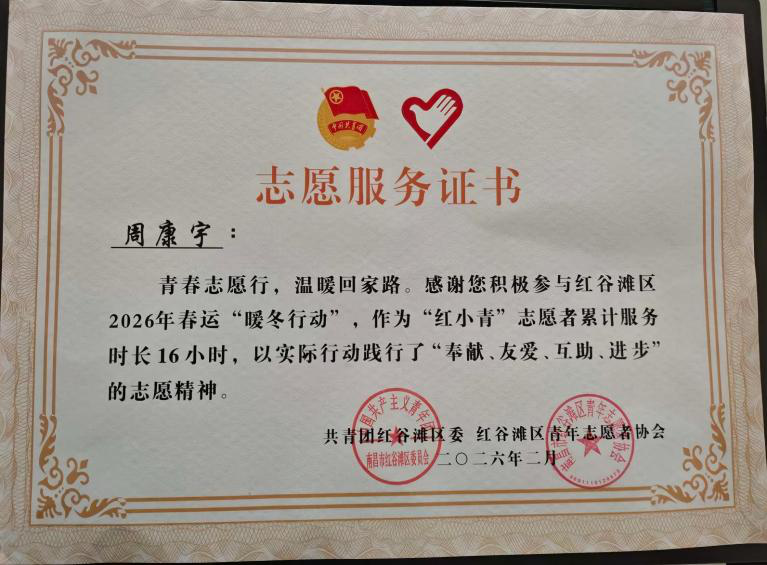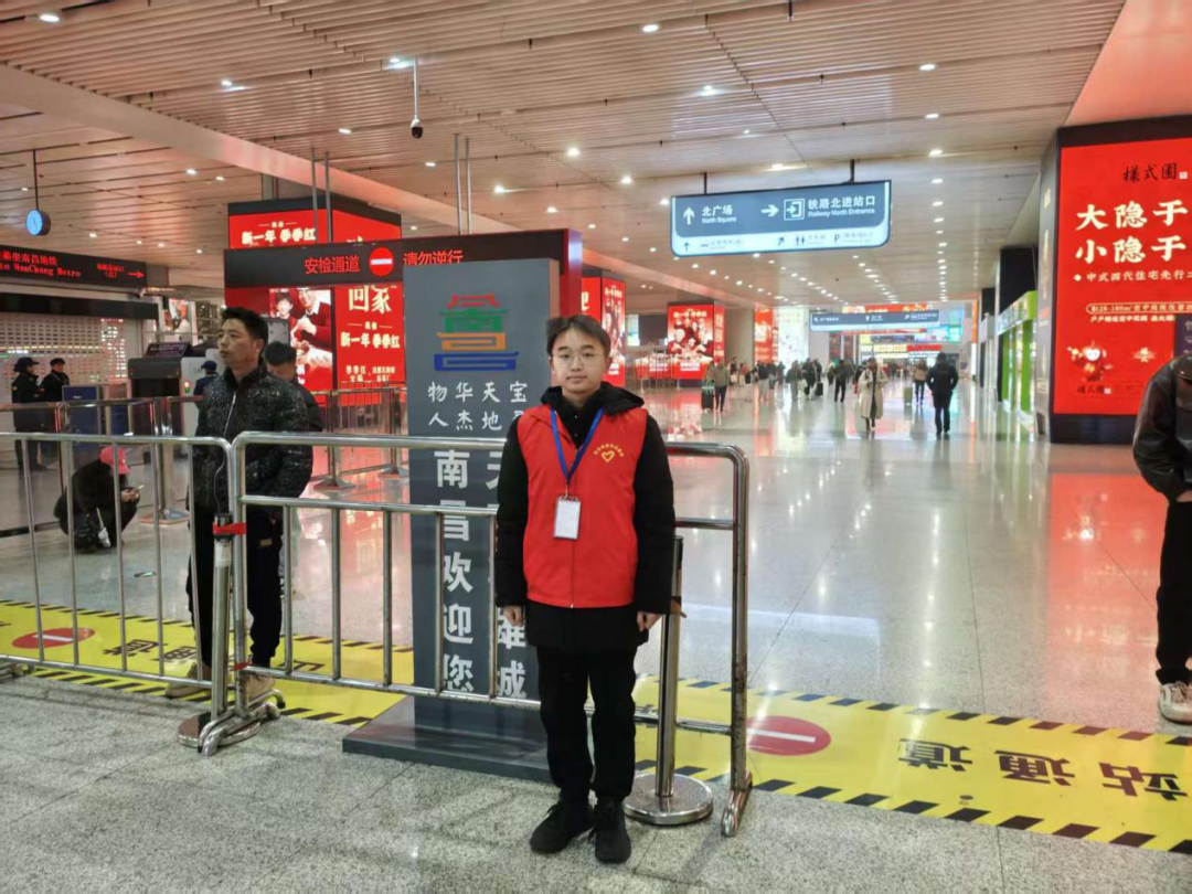 与此同时,我积极响应共青团红谷滩区委号召,参与南昌西站春运暖冬志愿服务,在售票厅、候车室为旅客提供引导咨询、行李搬运、特殊旅客帮扶等服务,用温情护航春运出行,在奉献中锤炼品格、增长才干。春运服务强度远超预期,长时间站立、反复答疑、应对繁忙客流,身体虽疲惫却从不懈怠。面对旅客急躁情绪、老年乘客操作困难、突发状况等难题,在工作人员与其他志愿者们的帮助下,我学会了沉着应对、耐心沟通、换位思考。