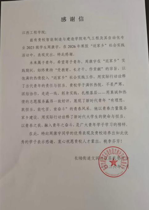 此次返家乡社会实践,是一次理论与实践的深度融合,更是一次成长与蜕变的宝贵历练。我的实践事迹有幸被共青团红谷滩区委宣传报道,同时收到了社区居委会的感谢信,并获颁荣誉证书。这份沉甸甸的认可与鼓励,让我备受鼓舞、倍感珍惜,也更加坚定了我服务家乡、奉献社会的信念与担当。