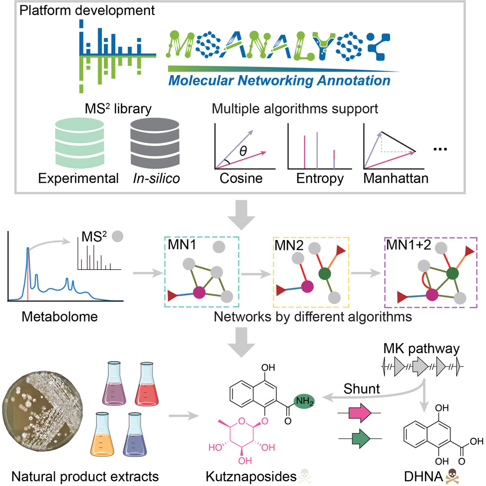 研究人员应用该平台分析模式放线菌,借助多算法融合的分子网络解析,成功发现了一类新型芳香糖苷化合物kutznaposides A-F,活性实验表明其具有抗菌与抗氧化作用。多组学分析进一步揭示,kutznaposides C-F来源于一条新发现的甲萘醌旁路代谢途径,该途径通过将有毒中间体转化为低毒糖苷,帮助菌体缓解氧化应激以实现自我解毒。MSanalyst平台为天然产物挖掘与代谢途径解析提供了高效、灵活的工具,极大加速从微生物资源库、发酵样本中挖掘新型酶、药物先导化合物、功能添加剂等高价值产品的进程,缩短研发周期。本研究发现的具有抗菌和抗氧化活性的kutznaposides系列化合物,可以是潜在的产业化候选对象。