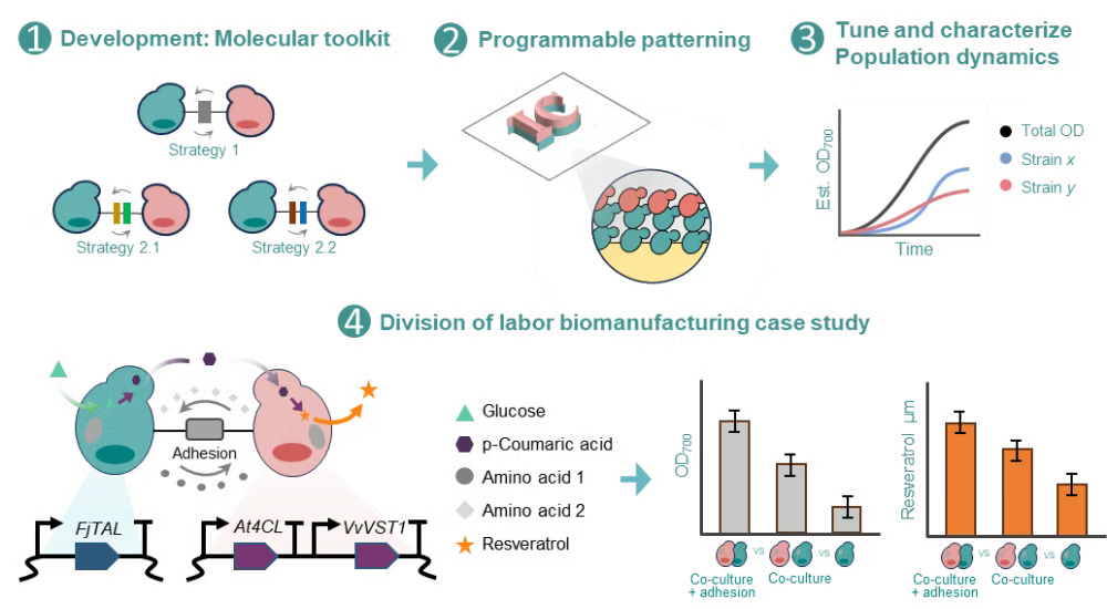 研究团队以白藜芦醇合成为例,将代谢途径拆分至不同酵母细胞,通过可编程细胞黏附构建空间有序的酵母群落,显著提升了目标产物的产量并增强了系统稳定性与鲁棒性。这项研究建立了一种将细胞黏附、空间组织和代谢功能相结合的多细胞工程新范式,其模块化、可扩展的设计框架为构建高效、稳定的合成微生物群落提供了重要工具。通过空间组织优化代谢互馈,直接提升了目标产物的制造效率和规模化过程的稳定性。利用该技术拓展生物制造系统的设计维度,可快速构建针对不同产物的定制化微生物群落,极大加速了产品开发周期。