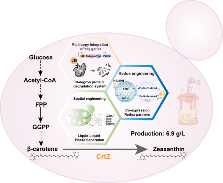 2026年1月9日,山东大学祁庆生、侯进团队在Green Chemistry上发表了研究成果,成功利用解脂耶氏酵母构建了一株高效合成玉米黄质的工程菌株。研究团队通过引入蛋白质降解标签的多拷贝整合技术,提升关键羟化酶PaCrtZ的表达水平。同时,共表达外源氧化还原蛋白并优化NADPH再生系统,增强了羟化反应效率。此外,团队创新性地利用液-液相分离原理构建无膜细胞器,对甲羟戊酸途径相关酶进行空间组装,从而强化了前体供应能力。在摇瓶条件下,通过优化培养温度与金属离子等参数,玉米黄质产量已提升至1780 mg/L;进一步在1 L发酵罐中进行补料分批培养,最终产量高达6.9 g/L,显著高于以往报道。