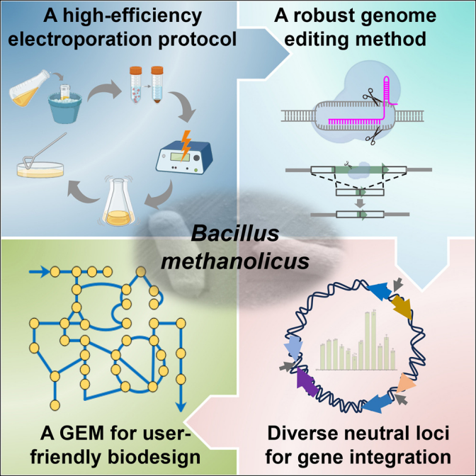 甲醇芽孢杆菌是一种能高效利用廉价原料甲醇、耐受高温与海水条件的天然菌株,在一碳生物制造中潜力巨大,但其应用因缺乏高效的基因组编辑与设计技术而长期受限。