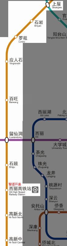 站点设置:高新北站、西丽高铁站(暂缓开通)、石鼓站、留仙洞站、百旺站、应人石站、罗租站、石岩站、上屋站(9 座地下站)
