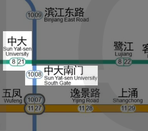 换乘情况:暂不具备直接换乘其他地铁线路条件,与8号线中大站地面出闸换乘