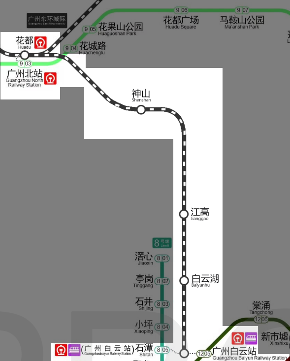 换乘情况:广州白云站与12号线换乘,与8号线石潭站连接