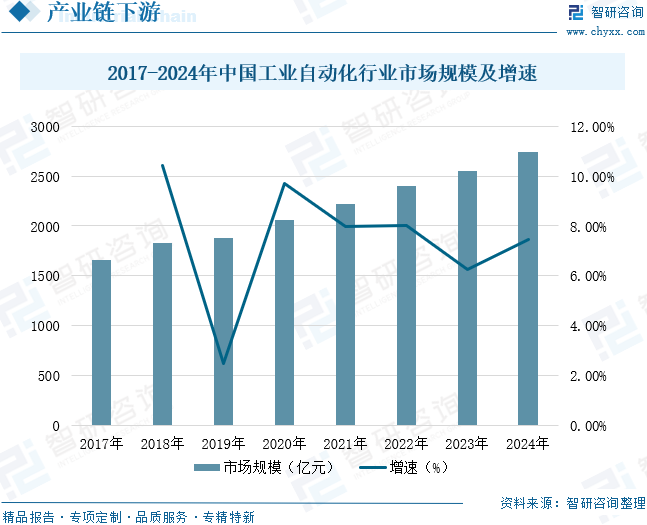 工业自动化是电动缸的应用领域之一。在机械加工行业,电动缸可用于数控机床的进给系统,实现高精度的刀具移动和定位,提高加工精度和效率。在自动化生产线中,电动缸可用于物料搬运、装配作业等环节,如将工件准确地推送或抓取到指定位置,替代传统的气缸或液压缸,具有动作平稳、控制、响应速度快等优点。工业自动化涉及电力、电子、计算机、人工智能、通讯、机电等诸多领域,近年来随着工业自动化技术的不断成熟,生产、控制、反馈和辅助装置等工业自动化设备在机床、新能源、工业机器人、医疗等行业的应用规模不断扩大,工业自动化市场得到了长足的发展。数据显示,中国工业自动化行业市场规模从2017年的1657亿元增长至2024年的2739亿元,年复合增长率为7.44%。未来,随着工业4.0的深入推进和工业自动化水平的持续提升,将为电动缸行业带来更广阔的应用场景和持续增长的市场需求。