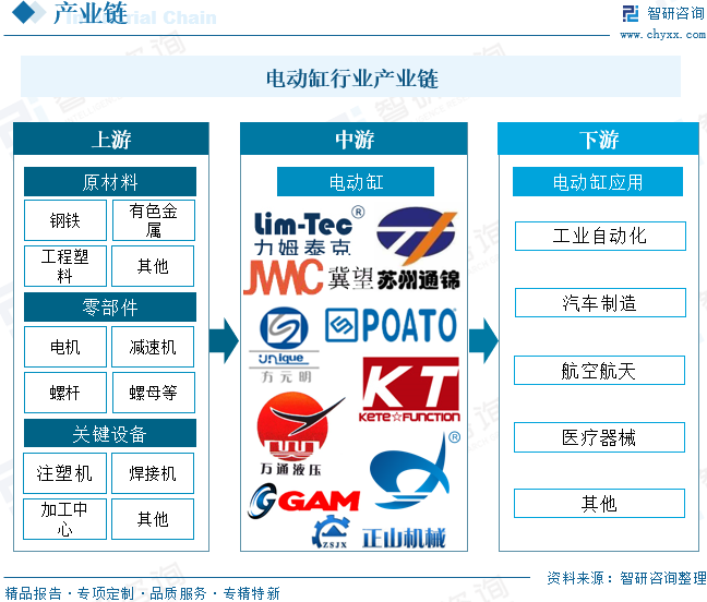 从产业链来看,电动缸产业链上游为原材料、零部件和关键设备,其中,原材料包括钢铁、有色金属(如铜、铝等)工程塑料等,这些材料是电动缸外壳、缸筒、传动部件等的主要制造原料。零部件包括电机、减速机、螺杆、螺母、导轨等;关键设备包括注塑机、焊接机、加工中心等。产业链中游为电动缸的生产制造环节。产业链下游为应用领域,包括工业自动化、汽车制造、航空航天、医疗器械等。