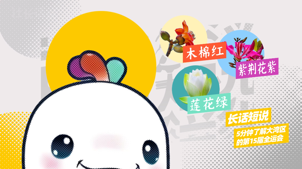 海豚头顶上还有三朵水花,分别代表了广州的木棉“红”、香港的紫荆“紫”,以及澳门的莲花“绿”,这也蕴含着三地携手的深刻寓意。