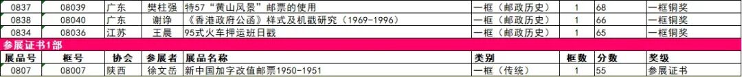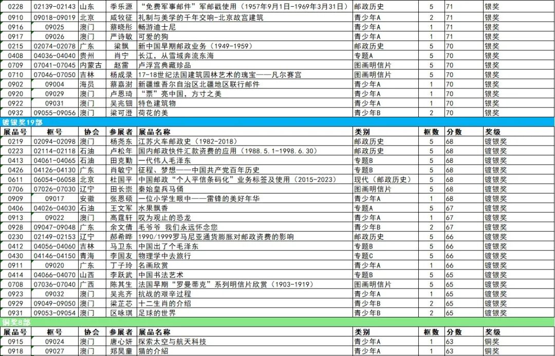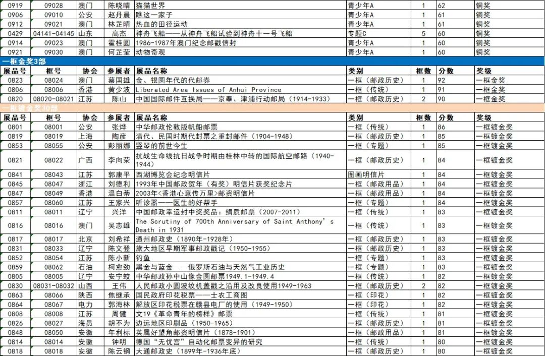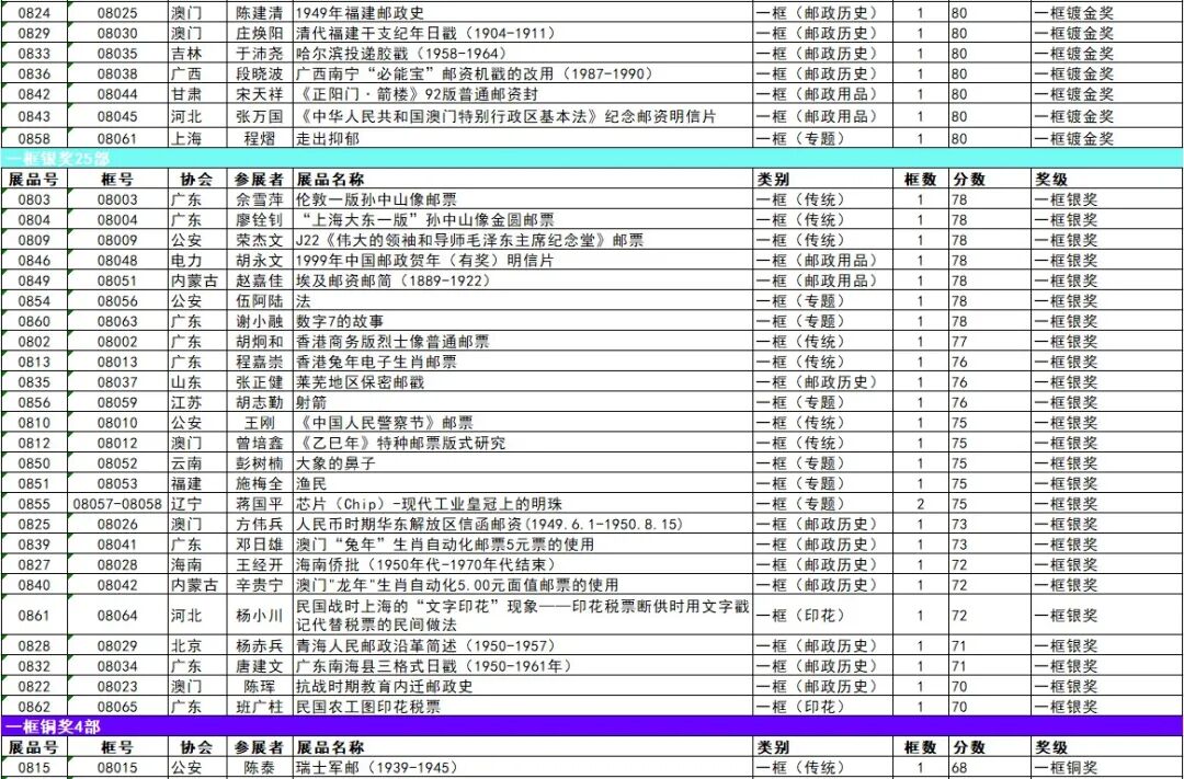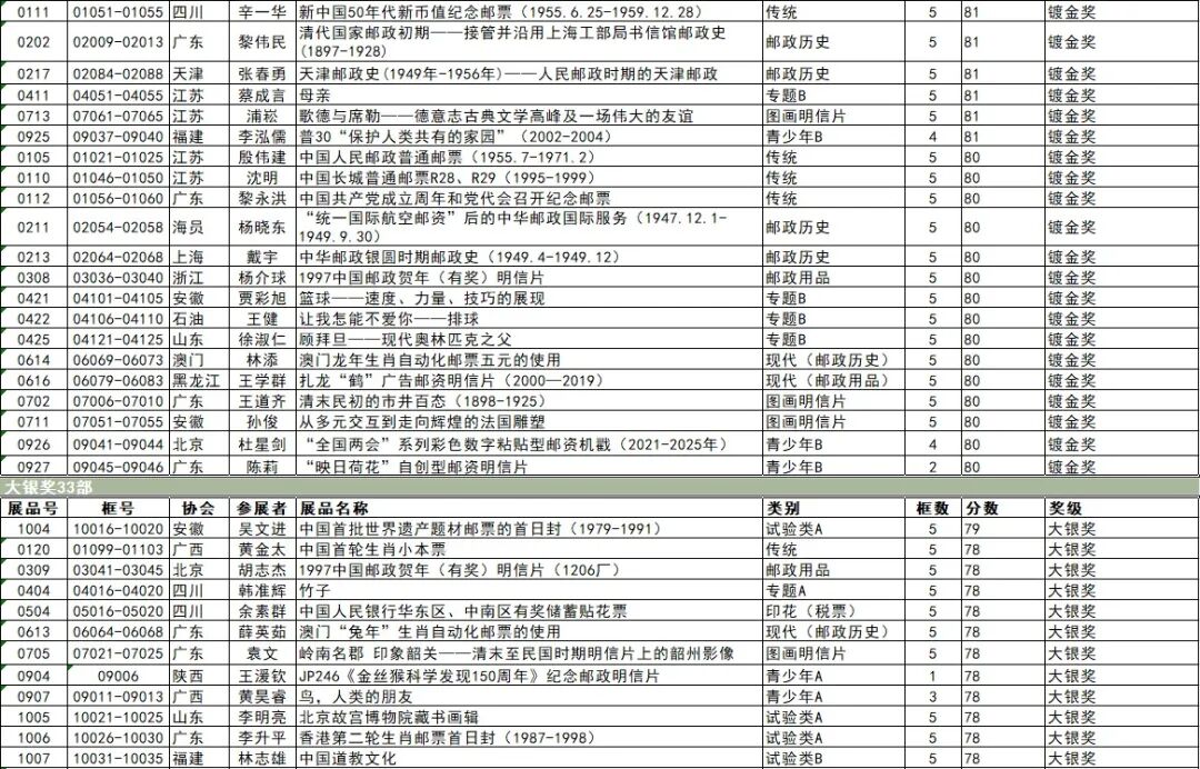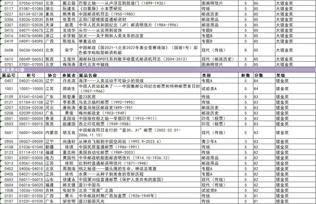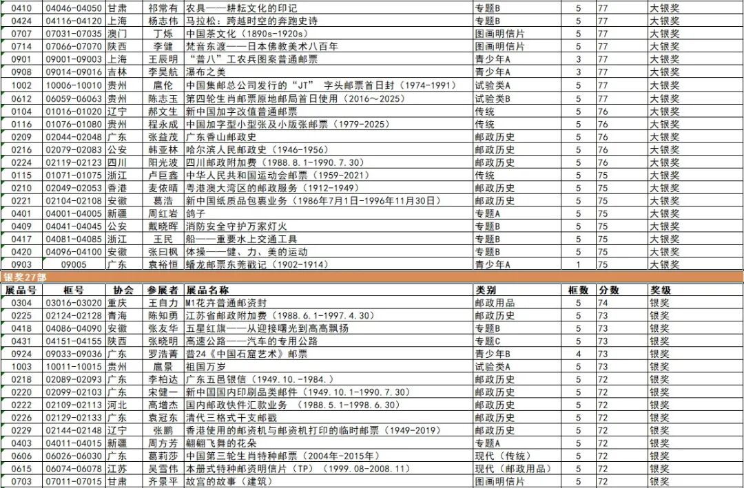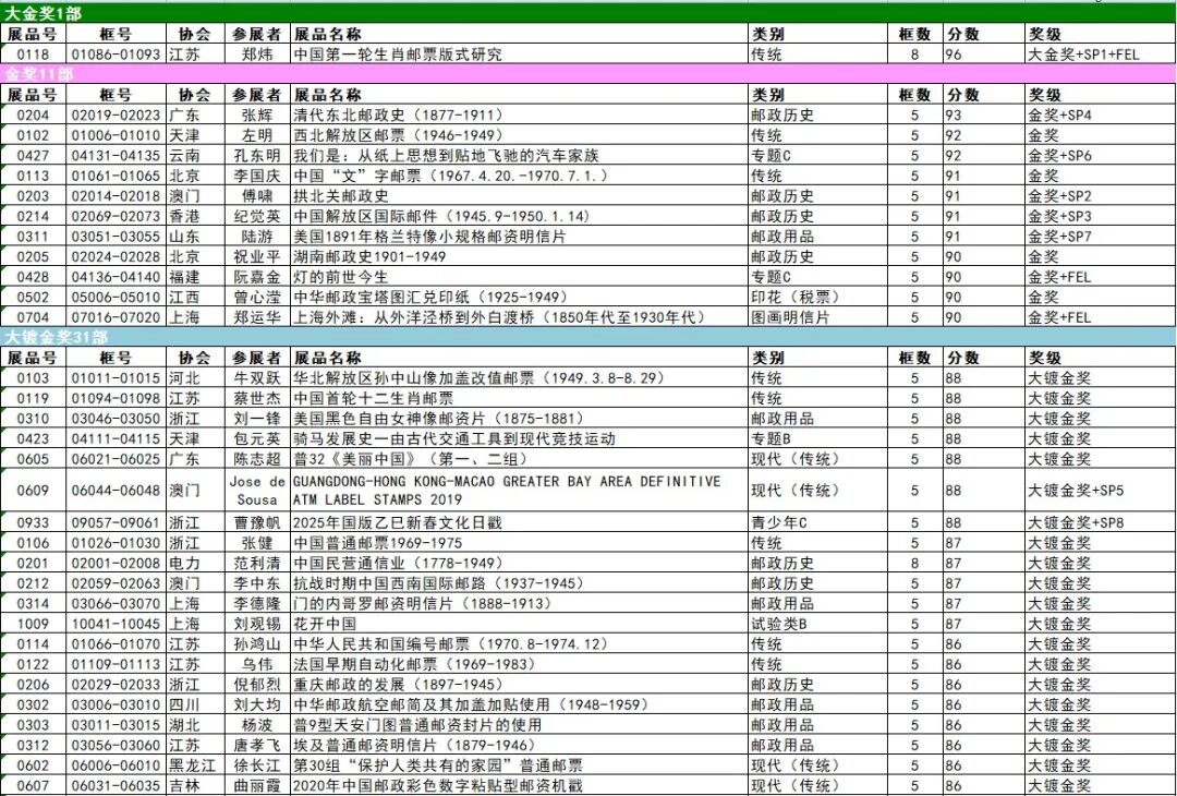 12月21日,经过严格评审,本届邮展评审委员会按照中华全国集邮联合会集邮展览评审规则,参照国际集邮联合会(FIP)集邮展览评审总规则及各类别评审专用规则和指导要点的评分标准,根据本次邮展评审的特别规则,经过多轮评审,最终确定获奖名单。本届邮展共评出大金奖1部、金奖11部、大镀金奖31部、镀金奖42部、大银奖33部、银奖27部、镀银奖19部、铜奖8部;评出一框金奖3部、一框镀金奖30部、一框银奖25部、一框铜奖4部。(来源: 中华全国集邮联合会)
