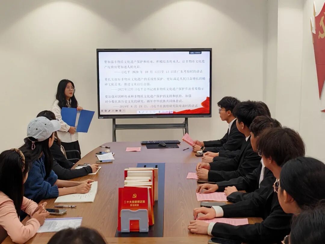 陈雅静书记带领大家学习习近平总书记关于文化遗产保护传承的重要论述,强调要扎实做好非物质文化遗产的系统性保护,加强文物保护利用和文化遗产保护传承,提高文物研究阐释和展示传播水平,让文物和文化遗产活起来,传播更多承载中华文化、中国精神的价值符号,为铸牢中华民族共同体意识、增强历史自觉、坚定文化自信贡献力量。