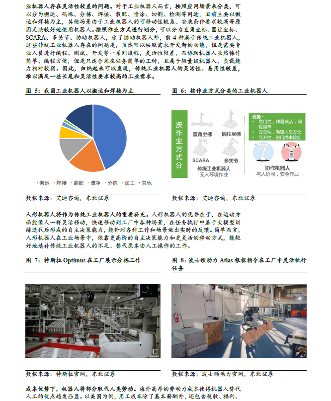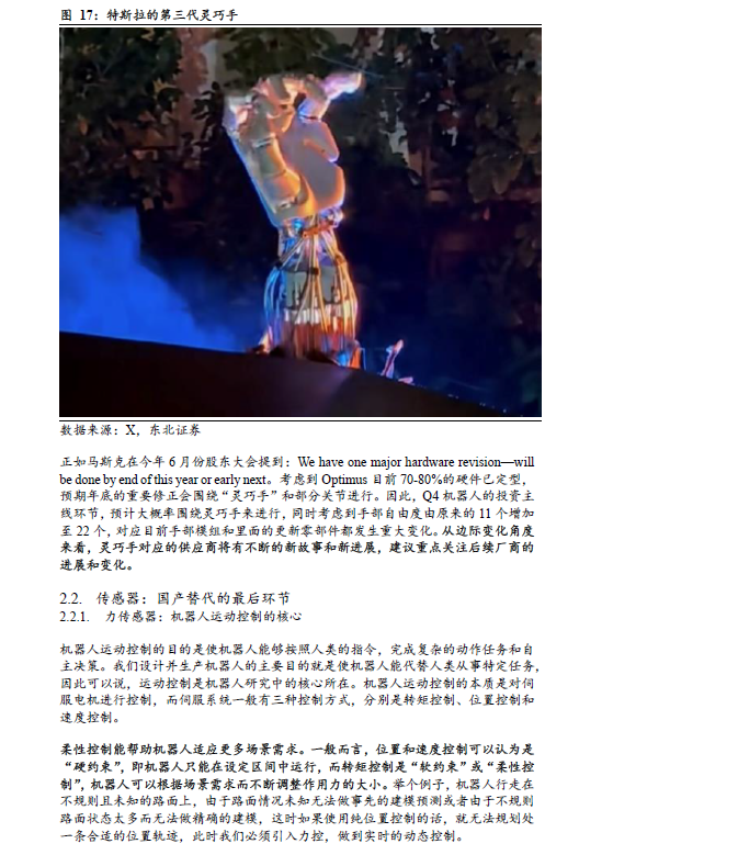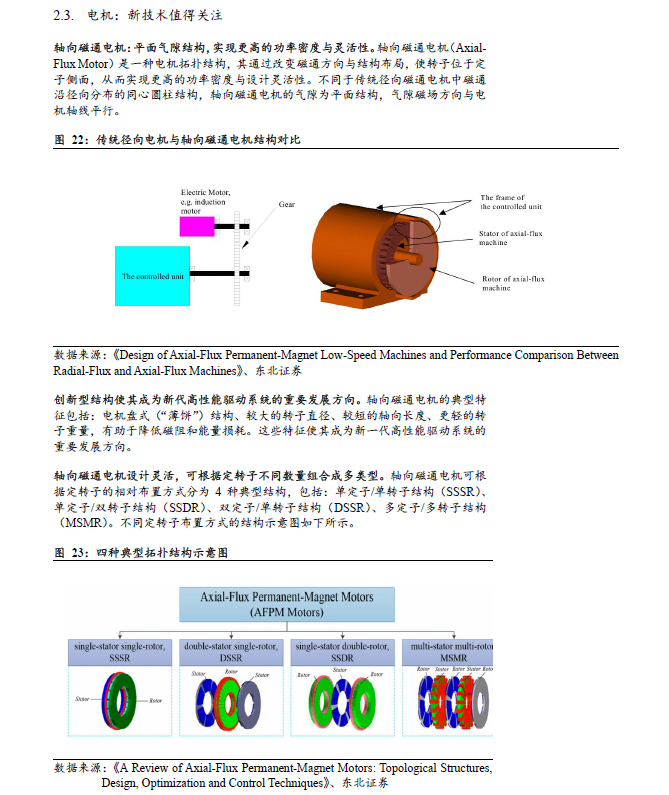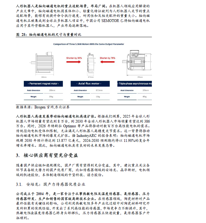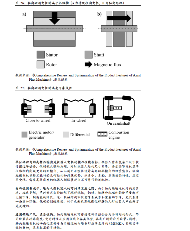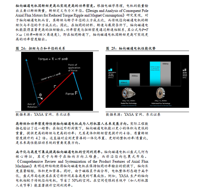 终端放量在即,产业链迎巨大机遇。人形机器人由多个核心零部件组成,包括但不限于灵巧手、传感器、电机、减速器、丝杠以及结构件等。随着特斯拉及国产主机厂加速推动量产落地,产业链亦同步推进规模化生产,而产业链的规模化势必带来国产零部件厂商的红利机遇,值得充分重视机器人零部件国产化带来的增量市场。灵巧手环节,作为人形机器人抓取物体的重要工具,其技术路线和配置方案直接决定了机器人在实际操作过程中的表现,因而究竟选择怎样的方案配置成为人形机器人落地前夕的最后一道难题。传感器环节,传感器作为机器人智能化最核心的零部件,重要性不言而喻,其中力传感器和触觉传感器是目前人形机器人最重要的零部件之二,同时也是国产化率相对较低的环节,因此随着终端放量,两大传感器均存在较大国产替代机会。电机环节,电机虽然是壁垒相对较低的环节,但随着主机厂对电机的要求提高,电机中的新技术和新产品逐步得到认可,技术壁垒和价值量也相应提高,建议重点关注包括轴向磁通电机、谐波磁场电机等新技术新方向。人形机器人高速发展带动轴向磁通电机高速扩张。传统径向电机受体积限制,无法满足人形机器人高精度关节需求,因此,轴向磁通电机具有良好的未来发展态势。