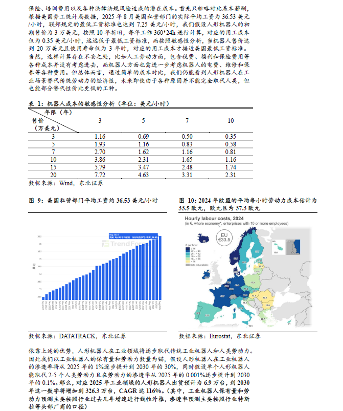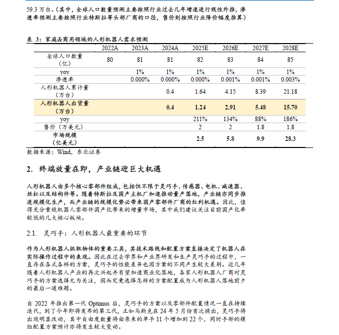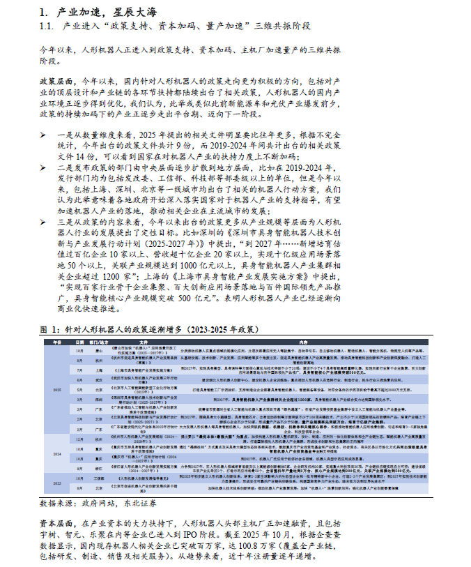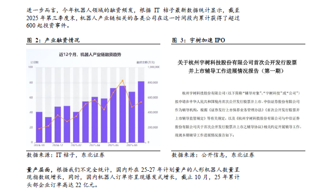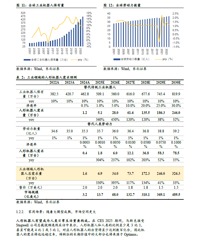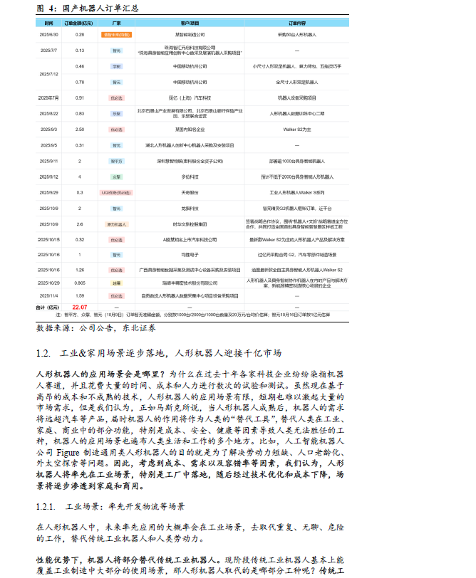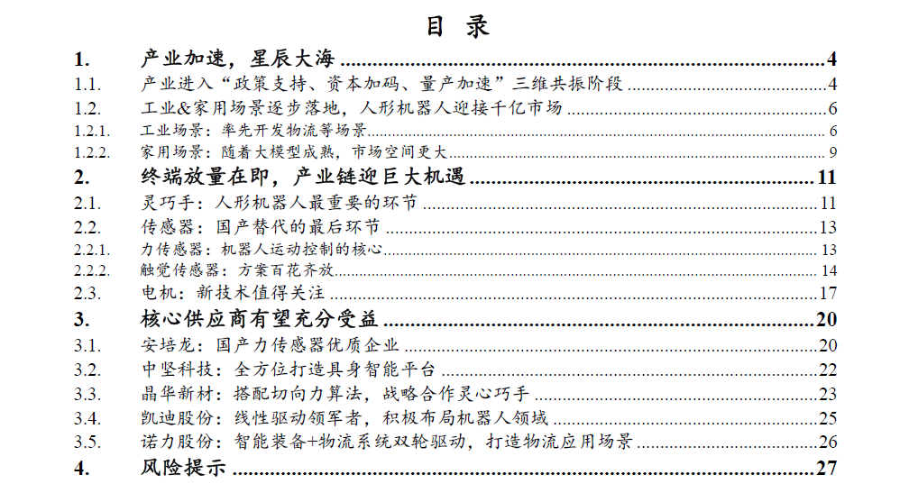 产业加速,星辰大海。今年以来,人形机器人正进入到政策支持、资本加码、主机厂加速量产的三维共振阶段。政策层面,今年以来,国内针对人形机器人的政策走向更为积极的方向,包括对产业的顶层设计和产业链的各环节扶持都陆续出台了相关政策,人形机器人的国内产业环境正逐步得到优化。资本层面,在产业资本的大力扶持下,人形机器人头部主机厂正加速融资,且包括宇树、智元、乐聚在内等企业已进入到IPO阶段。量产层面,根据我们不完全统计,国内外在25-27 年计划量产的人形机器人数量呈现指数级增长,同时,国内机器人订单亦呈现爆发式增长,截止10 月,25 年累计头部企业订单高达22 亿元。正如马斯克所说,当人形机器人成熟后,机器人的需求将远超汽车等产品,届时机器人的作用将作为人类的“替代工具”,替代人类在工业、家庭、商业中的部分功能,特别是人类无法胜任的工种,机器人的应用场景也遍布人类生活和工作的多个地方。因此,考虑到成本、需求以及容错率等因素,我们认为,人形机器人将率先在工业场景,特别是工厂中落地,随后经过技术优化和成本下降,场景将逐步渗透到家庭和商用。根据我们的测算,到2030 年工业场景的需求量将达到326.3 万台,家庭&商用场景的需求量达到59.3 万台。