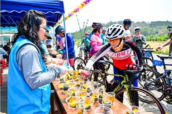 为了丰富骑游体验,信宜还在沿途赛道上设置了多个氛围点,融入地域文化的民俗表演、乐队轮番登场;补给点更是物资充足,特色零食搭配水饮,随时为选手补给能量;打卡点更是别出心裁,选址均在风景绝美之处,让骑友定格美好瞬间……